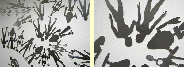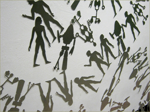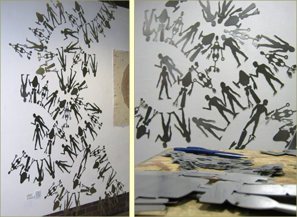 This mapping of future population uses figures which refer to primitive archetypical man/woman posture, and the wall composition reminisce cave-drawings or Egyptian papyrus, in a contemporary interpretation, silver and mechanized.