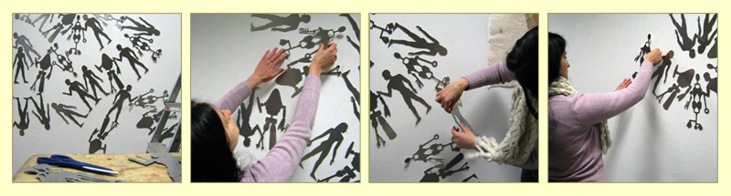 This site specific piece is an organic “wallpaper” pattern, resembling DNA chains and examining possibilities of human-machine-man-woman links. This “maze” is made of aluminum segments, crafted and installed on the gallery wall taking into account its shape and size.