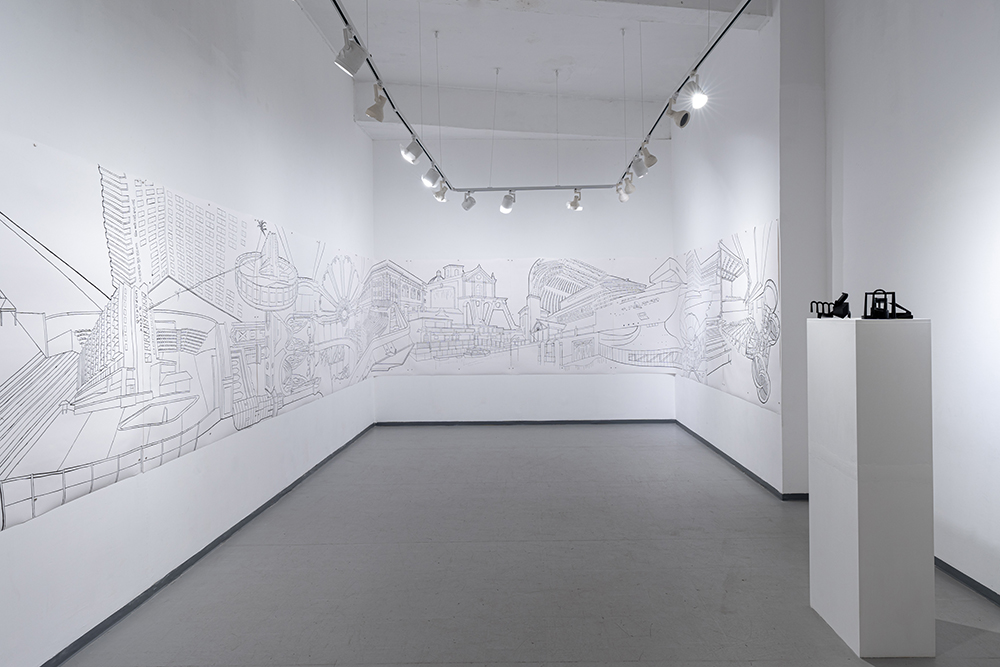 החלל מארח שתי עבודות קולאז'יות שונות ודומות. בראשונה רישום רפאים בדיו על נייר שעוטף את קירות הגלריה ומציג רצף אדריכלי בלתי אפשרי, פנורמה כאוטית, של אותן זירות בהן התרחשו חלק מההופעות. הענף השני הוא קולאז' אודיאלי של שירים וקטעי סאונד שהתנגנו בהופעות – פסקול דינמי שצובע את הרישום בגוונים שמתחלפים רגעית, שערך המוזיקאי רונן כוכבי. קישור לטקסט המלא שכתב אוצר התערוכה אבשלום סולימן. צילומי הצבה: דניאל חנוך. וידאו: דניאל חנוך, אורן דאי. התערוכה בתמיכת הקרן ליוצרים עצמאיים |