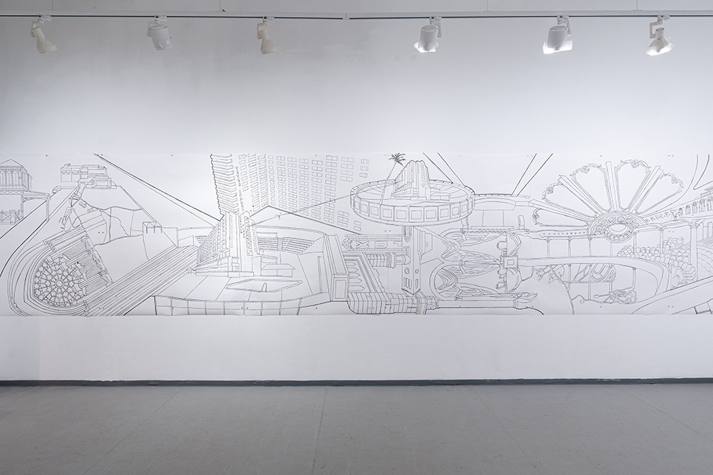 It is a scrutiny of the space that enables a disaster, without the event that initiates it (the show). The space inhabits two different but similar collage pieces. The first one is a ghost ink drawing on paper surrounding the gallery walls, presenting an impossible architectural sequence, a chaotic panorama of parts of the arenas that hosted the shows. The second branch is an audial collage of songs and sounds that were played on stage – a dynamic soundtrack mixed by musician Ronen Kohavi, that paints the drawing in changing colours over time. A link to the full exhibition text written by the curator Avshalom Suliman (Hebrew). Installation views: Daniel Hanoch. Video: Oren Dai, Daniel Hanoch. |