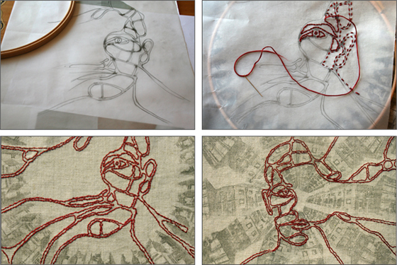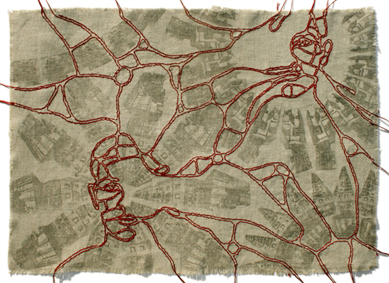 Images of the houses I used to live in form a repetative hand printed pattern, used as the background of the piece. The shapes created by the pattern dictate a new, embroidered, road map. The red roads evolve into two halves of a face, together depicting a full self portrait.