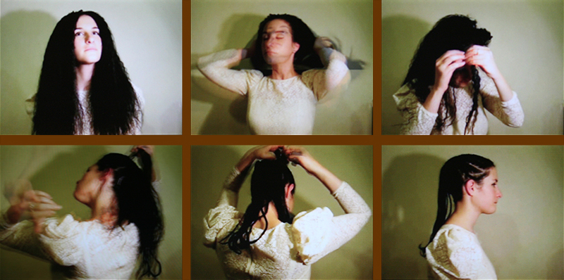 The piece is visually referring to traditional style and hair-do of this side of the river, and is presented in a traditional, almost religious composition on canvas on one hand, and as self inflicted process in the film. The foreignness and alienation pop out of the canvas-screen at second glance, with the uncertainty of origins, colour and nationality.